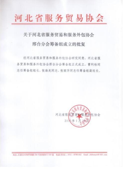 經(jīng)河北省服務(wù)貿(mào)易和服務(wù)外包協(xié)會研究同意,正式確定河北省服務(wù)貿(mào)易和服務(wù)外包協(xié)會邢臺分會由眾聯(lián)科技牽頭做好組織籌備工作,并專門成立籌備組,同時任命我公司總經(jīng)理曹利栓同志為籌備組組長,張海龍同志、張麗萍同志為籌備組副組長。