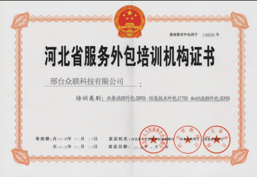 《河北省服務(wù)外包培訓(xùn)機(jī)構(gòu)證書》的獲得,不僅為眾聯(lián)科技長期發(fā)展服務(wù)外包產(chǎn)業(yè)增加了更多的信心,同時也為同樣從事服務(wù)外包企業(yè)的同行們培育更多、更優(yōu)秀的服務(wù)外包人員奠定了基礎(chǔ)。